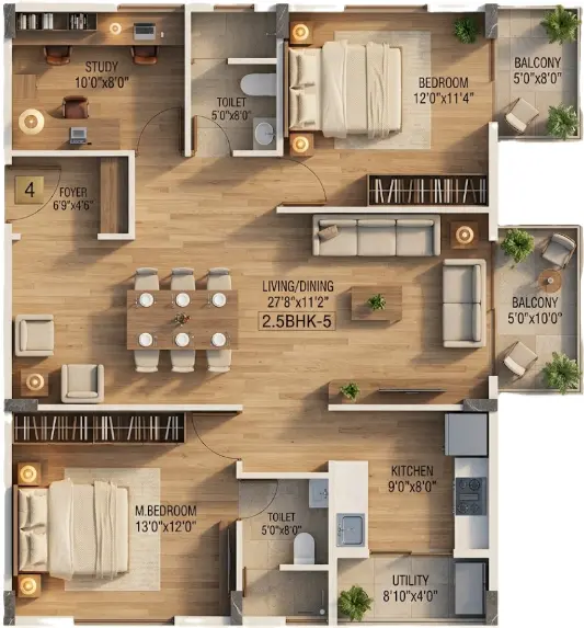 2 Bedrooms + Study Room · 2 Baths · 2 Balconies. Ideal for young professionals and small families.