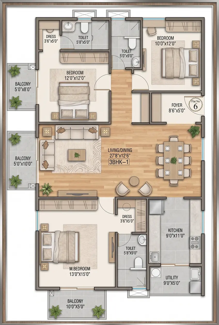 Enquire Now →3 Bedrooms · 3 Baths · 3 Balconies. Generous space for growing families who want room to breathe.